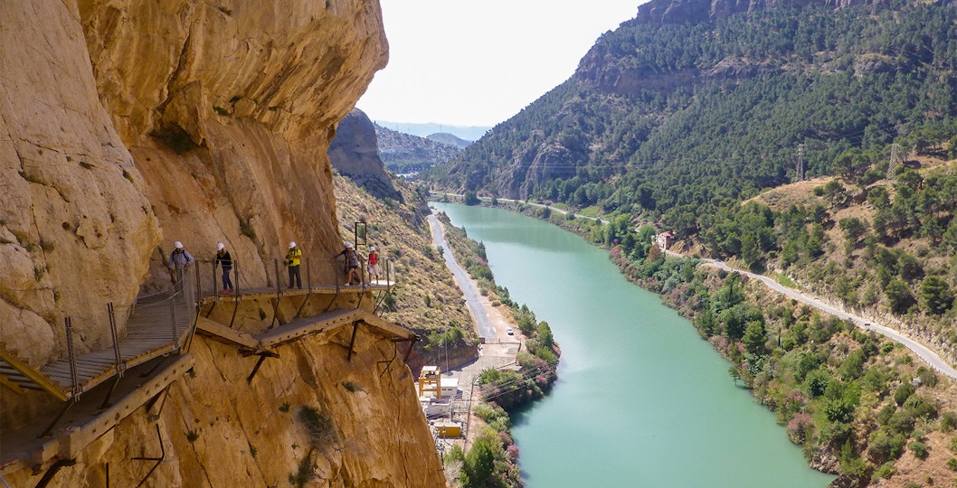 La forma más fácil de llegar al Caminito del Rey desde Málaga, Granada o Sevilla es unirse a un tour de un día con un servicio de autobuses lanzadera, que se encarga de todos los detalles del transporte y te recoge directamente en el acceso norte. Una vez allí, los autobuses lanzadera conectan con ubicaciones clave como el pueblo de El Chorro, el Centro de Visitantes (las entradas no están disponibles aquí, cómpralas con antelación) y el punto de partida, cerca del restaurante El Kiosko. Las lanzaderas funcionan cada 30 minutos de 08:30 a 18:00 en verano y a las 17:00 en invierno. Las entradas cuestan 2,50 € cada una y se pueden comprar por Internet, en el quiosco de la estación de tren o en el autobús (solo en efectivo).