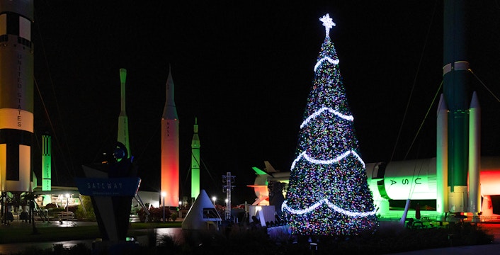 Kijk terwijl je daar bent uit naar de feestelijke decoraties in het bezoekerscomplex, waaronder een boom van 15 meter met meer dan 61.000 lichtjes, astronauten notenkrakers en het NASA gehaktbal kerstornament.