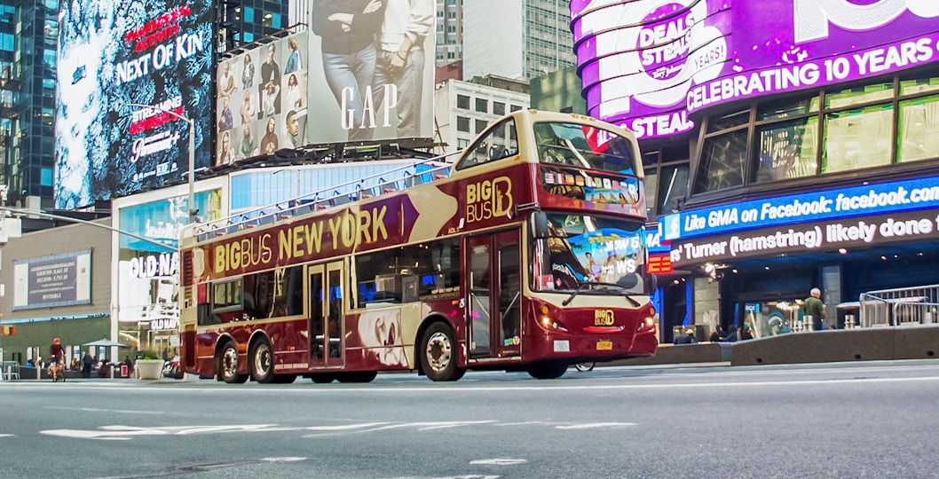 Key stops include Times Square, Central Park, the Statue of Liberty, and the Empire State Building.