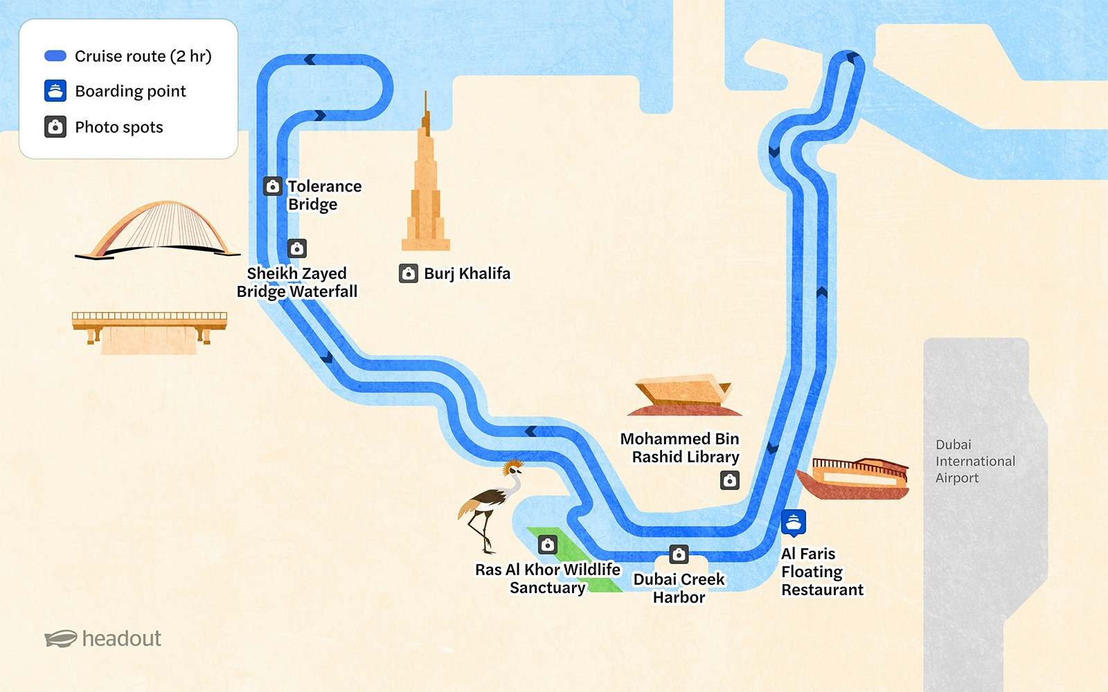 View popular sights like Burj Khalifa, Ras Al Khor Wildlife Sanctuary, Mohammed Bin Rashid Library, Sheikh Zayed Bridge Waterfall, Tolerance Bridge +4 more