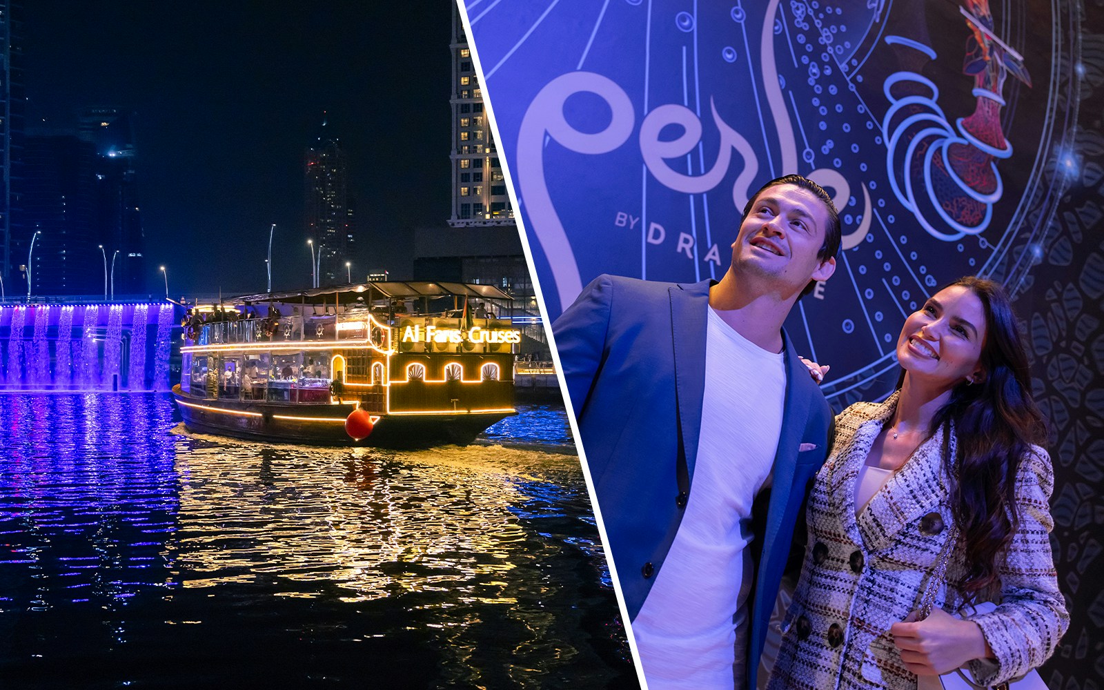 Dine & Dazzle Evening Package: Dubai Canal Dinner Cruise with Unlimited Drinks + La Perle Show